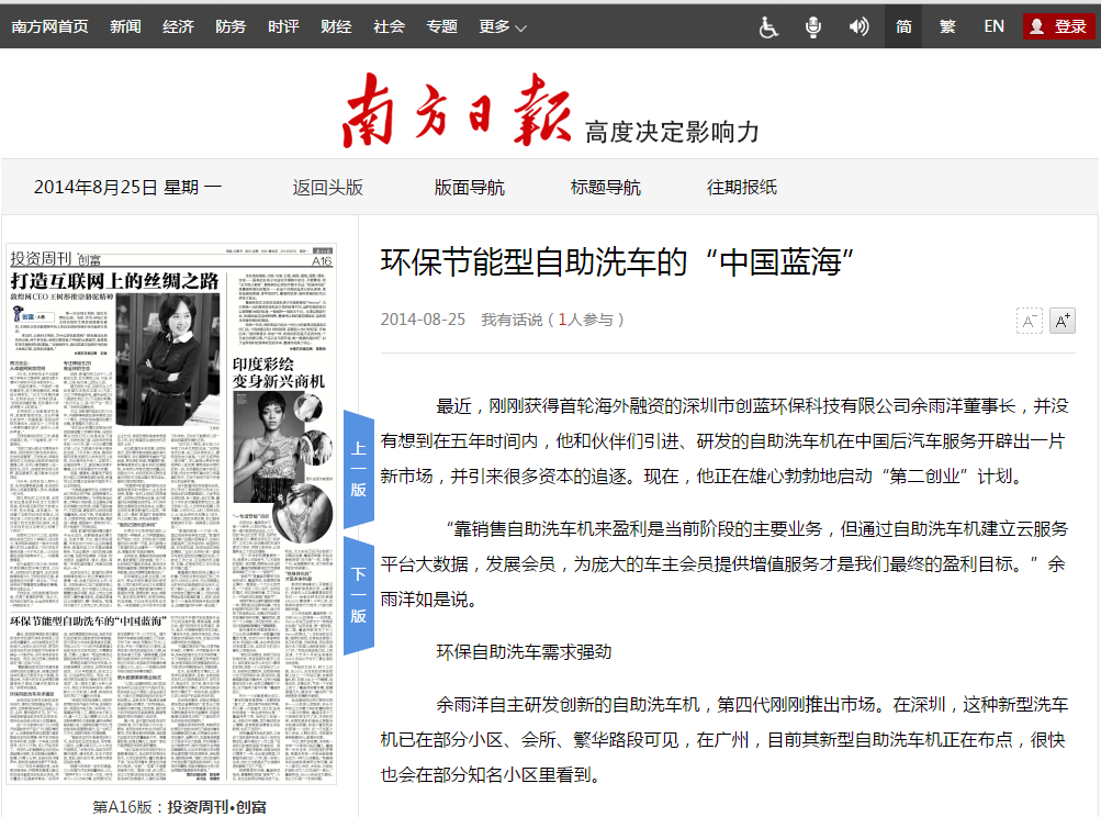 2014年08月25日南方日報、網(wǎng)易財經(jīng)對車海洋智能自助洗車機專題報道