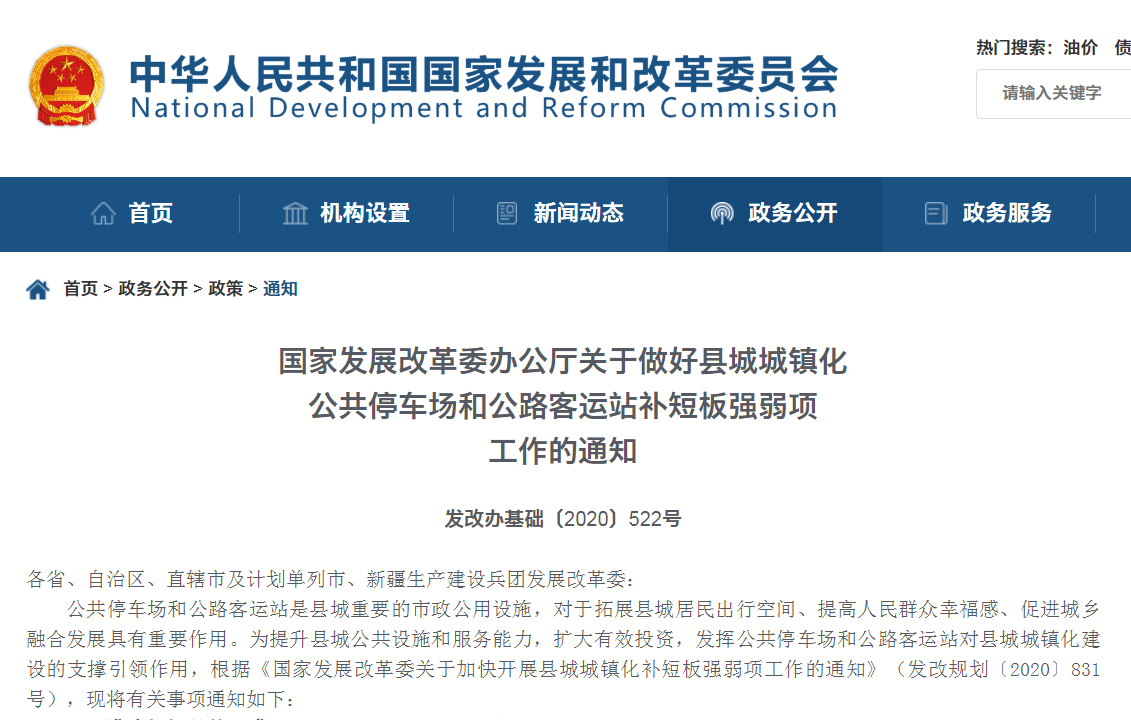 國家發(fā)展改革委辦公廳關(guān)于做好縣城城鎮(zhèn)化公共停車場和公路客運站補短板強弱項工作的通知