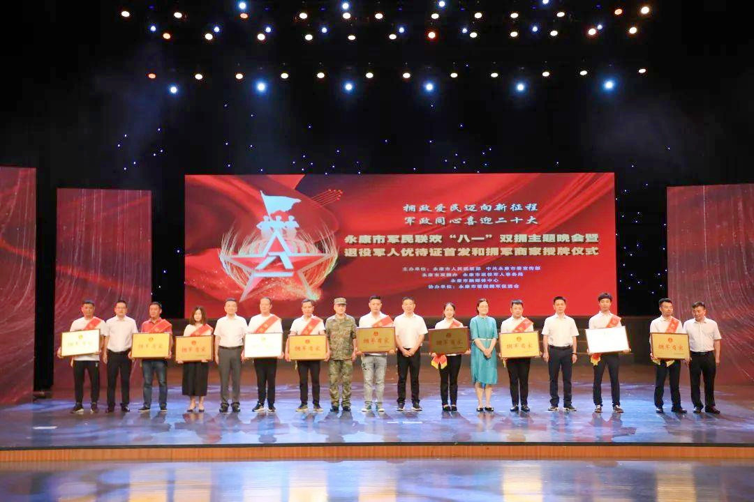 擁政愛民邁向新征程,軍政同心喜迎二十大。7月29日晚,在“八一”建軍節(jié)到來之際,浙江省永康市軍民聯(lián)歡“八一”雙擁主題晚會暨退役軍人優(yōu)待證首發(fā)和擁軍商家授牌儀式在永康市融媒體中心廣電大劇院隆重舉行..