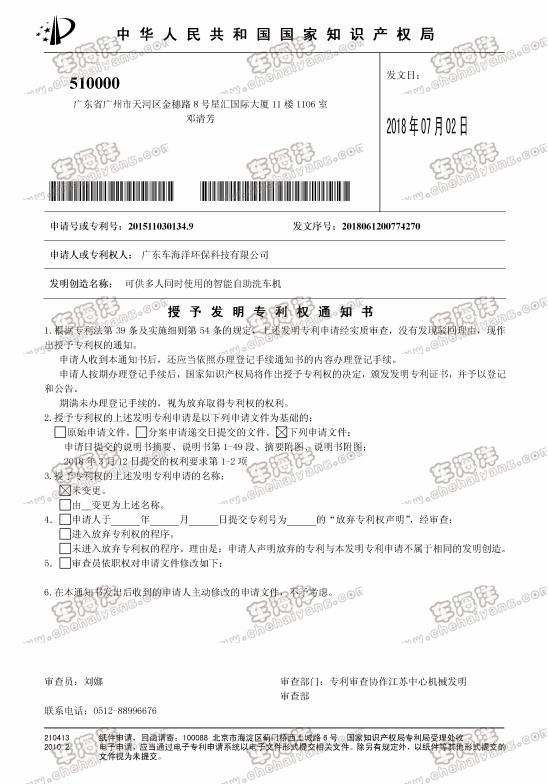 近日,車海洋榮獲中華人民共和國(guó)國(guó)家知識(shí)產(chǎn)權(quán)局頒發(fā)授予發(fā)明專利權(quán)通知書,“可供多人同時(shí)使用的智能自助洗車機(jī)”成為車海洋又一項(xiàng)國(guó)家發(fā)明專利。 在智能自助洗車機(jī)領(lǐng)域,車海洋擁有強(qiáng)大的研發(fā)團(tuán)隊(duì)..