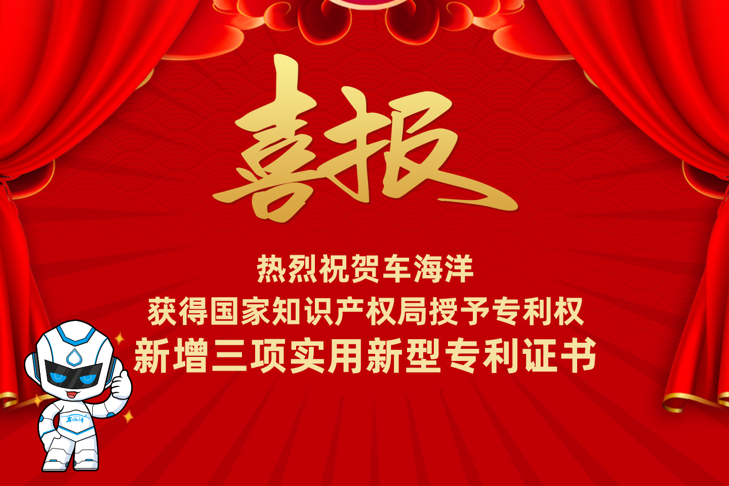 熱烈祝賀車海洋再次獲得三項(xiàng)實(shí)用新型專利證書!