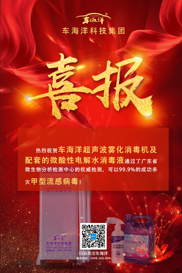 熱烈祝賀車海洋超聲波霧化消毒機(jī)及配套的微酸性電解水消毒液正式通過了廣東省微生物分析檢測中心的權(quán)威檢測,對甲型流感病毒的成功殺滅率高達(dá)99.9%!