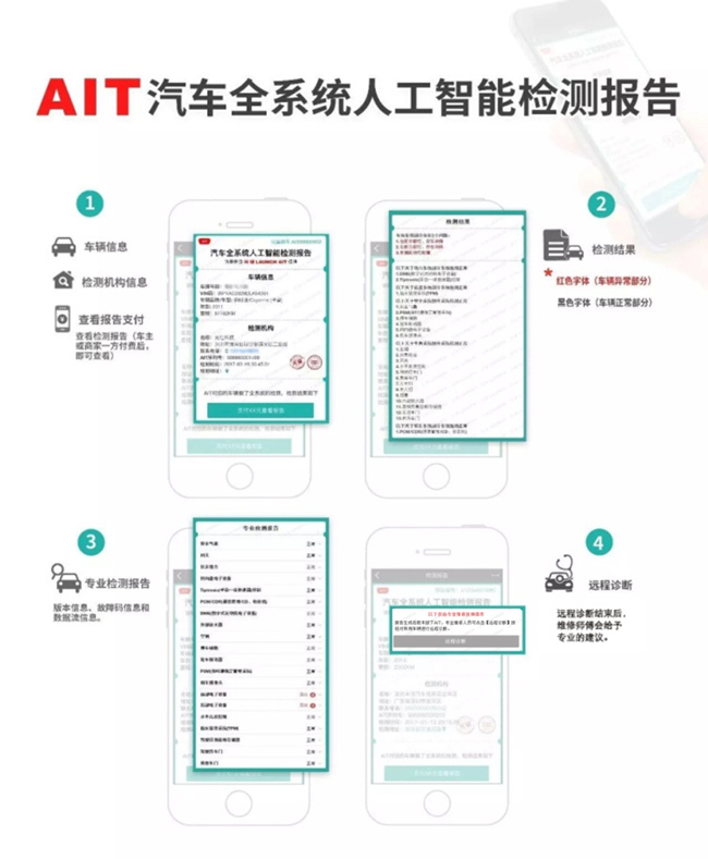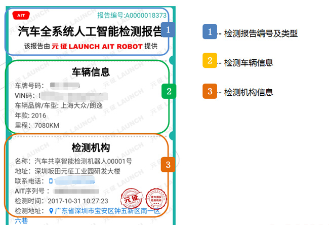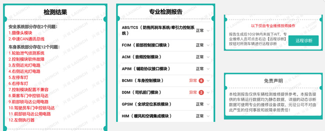 檢測(cè)報(bào)告主要內(nèi)容包括:車輛信息及檢測(cè)機(jī)構(gòu)信息、檢測(cè)結(jié)果、遠(yuǎn)程診斷。