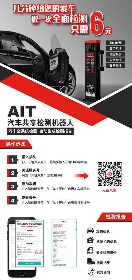 AIT汽車共享檢測(cè)機(jī)器人是一款具備人工智能、汽車全自動(dòng)、全系統(tǒng)檢測(cè)工具,用戶只需將設(shè)備連接至車輛診斷座,打開(kāi)車輛點(diǎn)火開(kāi)關(guān),即可實(shí)現(xiàn)無(wú)需人工干預(yù)、無(wú)需界面交互的車輛全系統(tǒng)檢測(cè)。除具備人工智能、全自動(dòng)全系統(tǒng)檢測(cè)、即插即用等該產(chǎn)品的特性外,主要在于采用共享、自助模式。