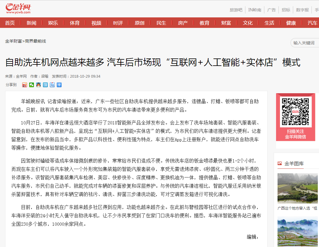 金羊網(wǎng)報道:自助洗車機網(wǎng)點越來越多 汽車后市場現(xiàn)“互聯(lián)網(wǎng)+人工智能+實體店”模式