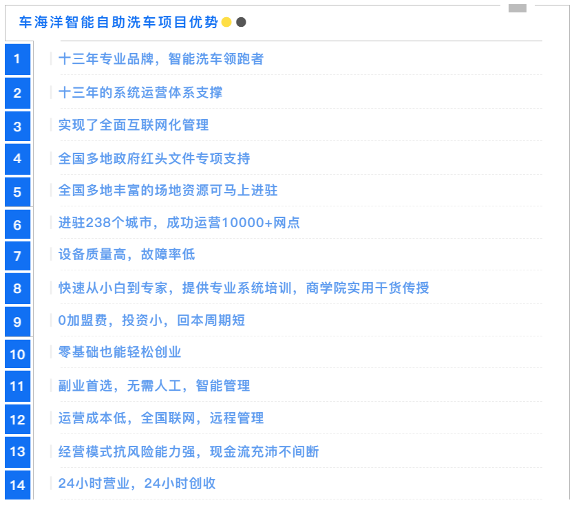 國家支持開展城市公共服務(wù)設(shè)施建設(shè), 抓住這個風(fēng)口,開設(shè)一個智能自助洗車網(wǎng)點,你值得擁有!沒有高昂的房租和人工成本,不怕股市波動,不怕被割韭菜,自己當(dāng)老板,實現(xiàn)創(chuàng)富夢!有穩(wěn)健的現(xiàn)金流收入,無需人工值守,24小時產(chǎn)生收益,這樣的投資難道不香嗎?