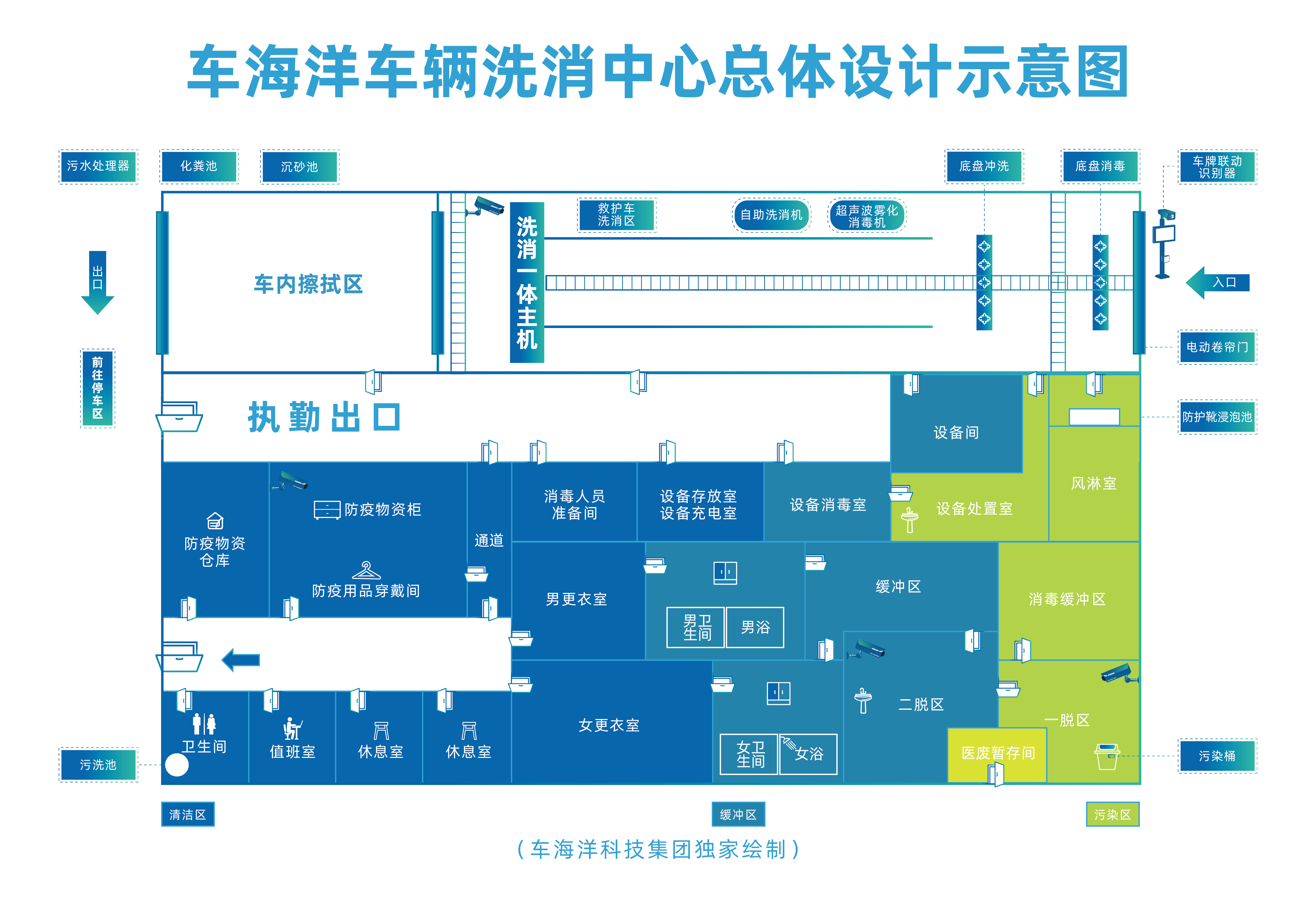 值得一提的是,車海洋智能洗消中心建設(shè)嚴(yán)格遵循醫(yī)療行業(yè)院感流程的各項標(biāo)準(zhǔn),以及各地實際的院感要求,采用單向通道原則和“三區(qū)二通道”規(guī)范設(shè)計,將車輛通道與人員通道有效區(qū)隔,人車分流洗消作業(yè),實行閉環(huán)管理。其中,車輛通道經(jīng)過特別設(shè)計,依次設(shè)置排隊區(qū)、消毒準(zhǔn)備區(qū)、全自動清洗消毒區(qū)和洗消完成等待區(qū),提高車輛消殺效率;人員通道區(qū)分污染區(qū)、緩沖區(qū)和清潔區(qū),有效避免轉(zhuǎn)運可能導(dǎo)致的交叉感染風(fēng)險。