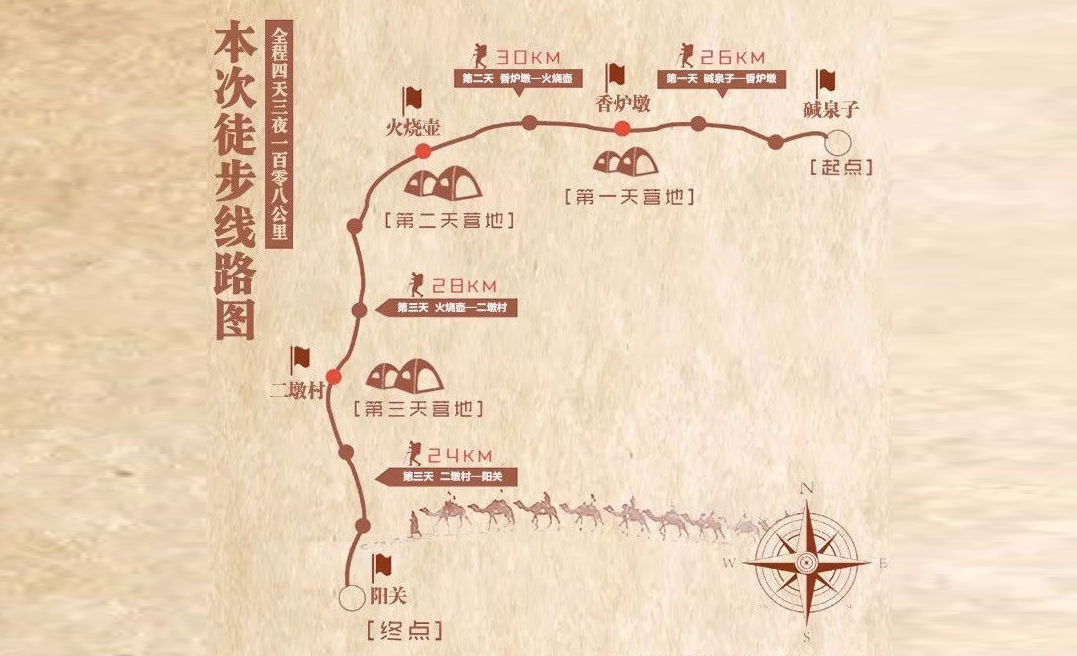 本次戈壁行設(shè)置在甘肅堿泉子至陽關(guān),共分四段,第一天行走長度為26公里;第二天也是全程最艱難的一段,長度為30公里;第三天為28公里,最后一段長度24公里,總長108公里。