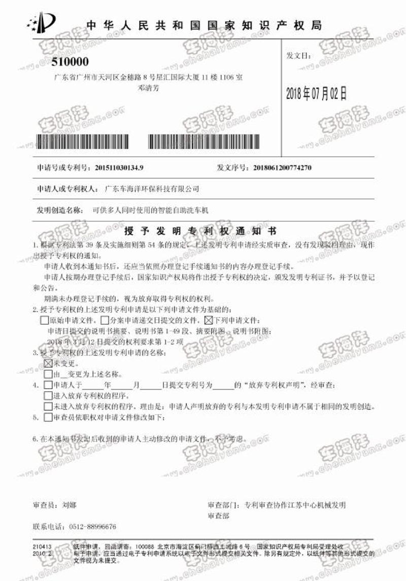 近日,車海洋榮獲中華人民共和國(guó)國(guó)家知識(shí)產(chǎn)權(quán)局頒發(fā)授予發(fā)明專利權(quán)通知書,“可供多人同時(shí)使用的智能自助洗車機(jī)”成為車海洋又一項(xiàng)國(guó)家發(fā)明專利。
