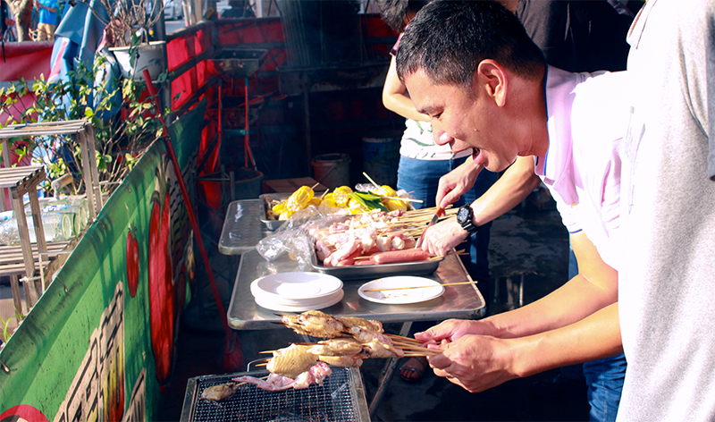 準(zhǔn)備好一切,就開(kāi)始烤啦!肉串放在烤架上滋滋的聲音聽(tīng)得大家心癢癢,此刻烤架旁邊的不再是專員、經(jīng)理、總監(jiān),而是嗷嗷待哺的吃貨們。高溫天氣和悶熱爐火也擋不住大家火辣辣的熱情!看看下面的煮男們,上得廳堂,下得廚房,這架勢(shì)像不像專業(yè)烤串的新疆小哥?
