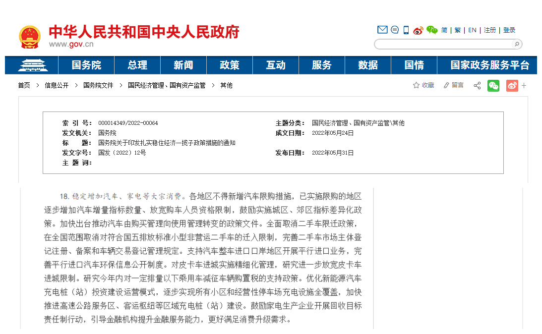 5月31日,國務院發(fā)布了一條《關(guān)于印發(fā)扎實穩(wěn)住經(jīng)濟一攬子政策措施的通知》,通知表示,為穩(wěn)定增加汽車消費,全面取消二手車限遷政策,在全國范圍取消對符合國五排放標準小型非營運二手車的遷入限制,完善二手車市場主體登記注冊、備案和車輛交易登記管理規(guī)定。