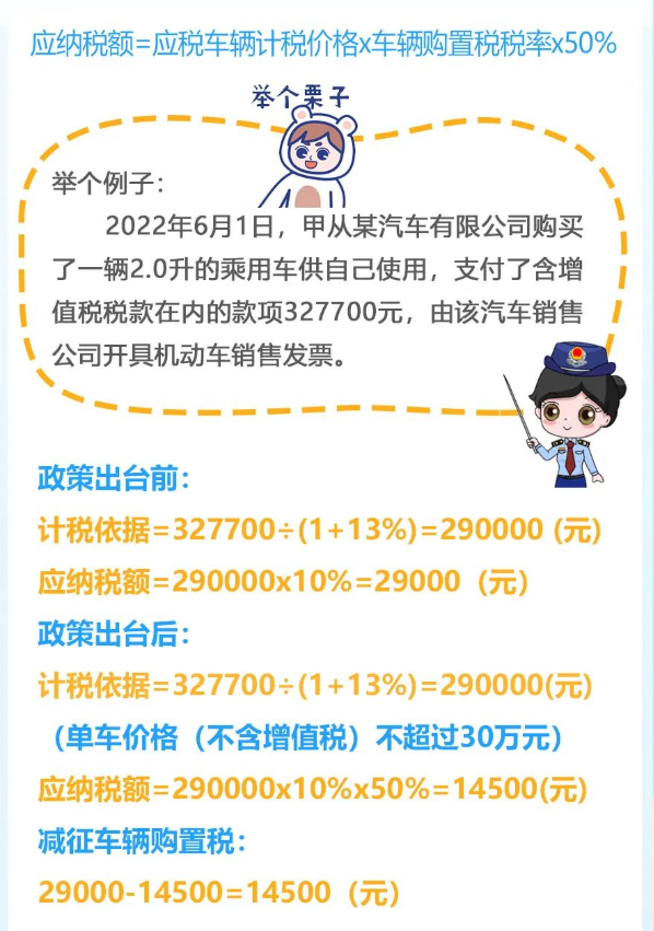 答:機動車銷售統(tǒng)一發(fā)票或海關(guān)關(guān)稅專用繳款書等有效憑證的開具日期在2022 年6月1日至2022年12月31日期間內(nèi)且單車價格(不含增值稅)不超過30萬元的2.0升及以下排量乘用車,減半征收車輛購置稅。