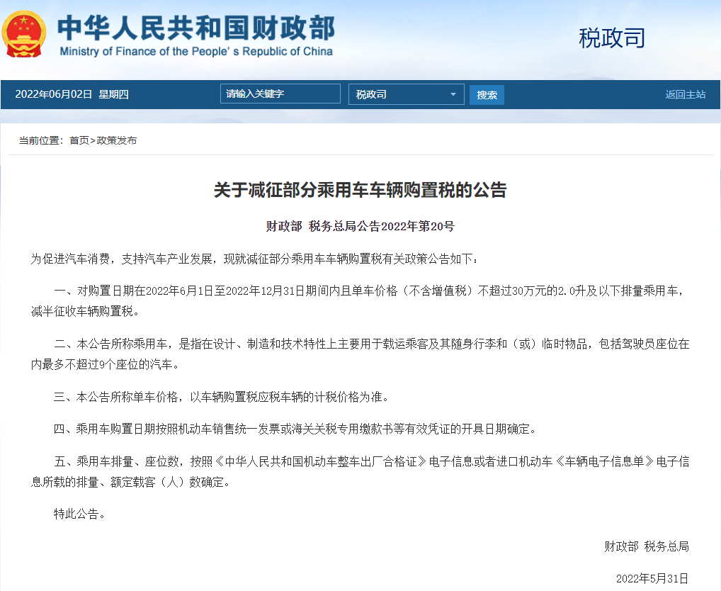 5月31日,財政部、稅務總局發(fā)布《關(guān)于減征部分乘用車車輛購置稅的公告》,減征部分乘用車車輛購置稅