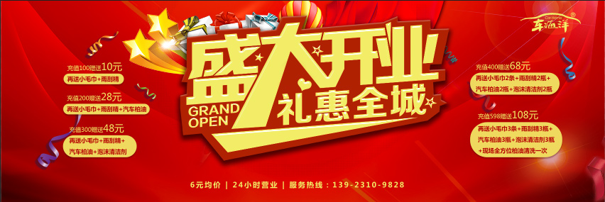 5、充值598贈(zèng)送108元;送3條小毛巾+3瓶雨刮精+3瓶汽車柏油+3瓶泡沫清潔劑+現(xiàn)場(chǎng)全方位柏油清洗一次