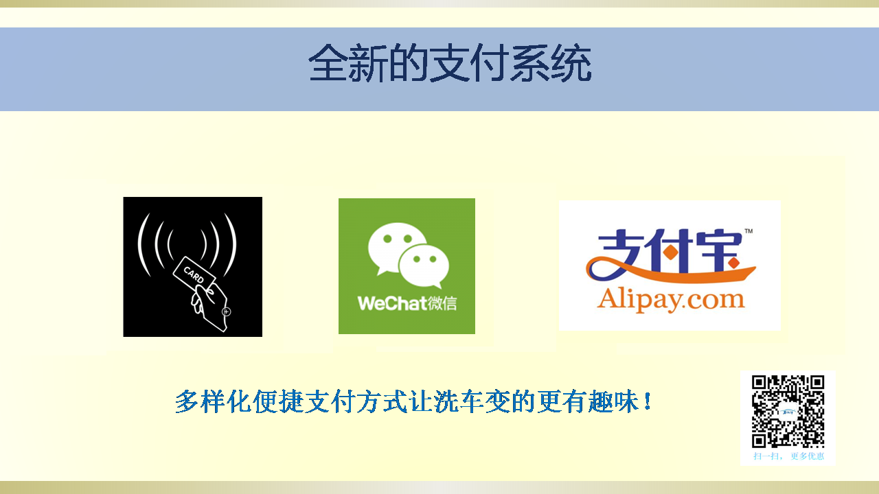 車海洋--智能自助洗車機支付方式:可選投幣、刷卡、微信支付
