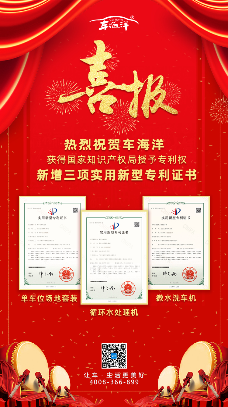 熱烈祝賀廣東車(chē)海洋環(huán)保科技有限公司的《微水洗車(chē)機(jī)》、《循環(huán)水處理機(jī)》和《單車(chē)位場(chǎng)地套裝》三項(xiàng)發(fā)明專利獲得國(guó)家知識(shí)產(chǎn)權(quán)局授權(quán)并頒發(fā)實(shí)用新型專利證書(shū)!